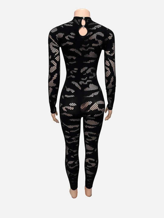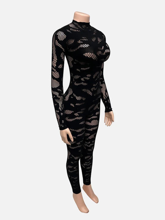 Viviblook Z1227JP01 Sexy Winter Jumpsuit Women Long Sleeved Hollow Tight Lace See Through Patchwork Bodycon Jumpsuit