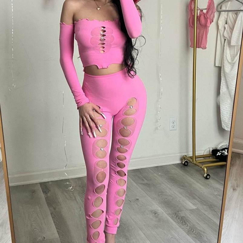 Viviblook Z519ST10 2025 New Women's Sexy Hollow Slim Fit Long Sleeved Hollow Out Knitted Suit 2-piece Set