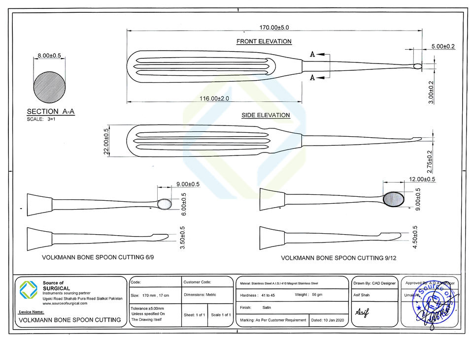 Volkman Manual Orthopedic Curettes Single-Ended Steel and Stainless Steel Scoop Stainless Steel Material Dental Surgical Bone