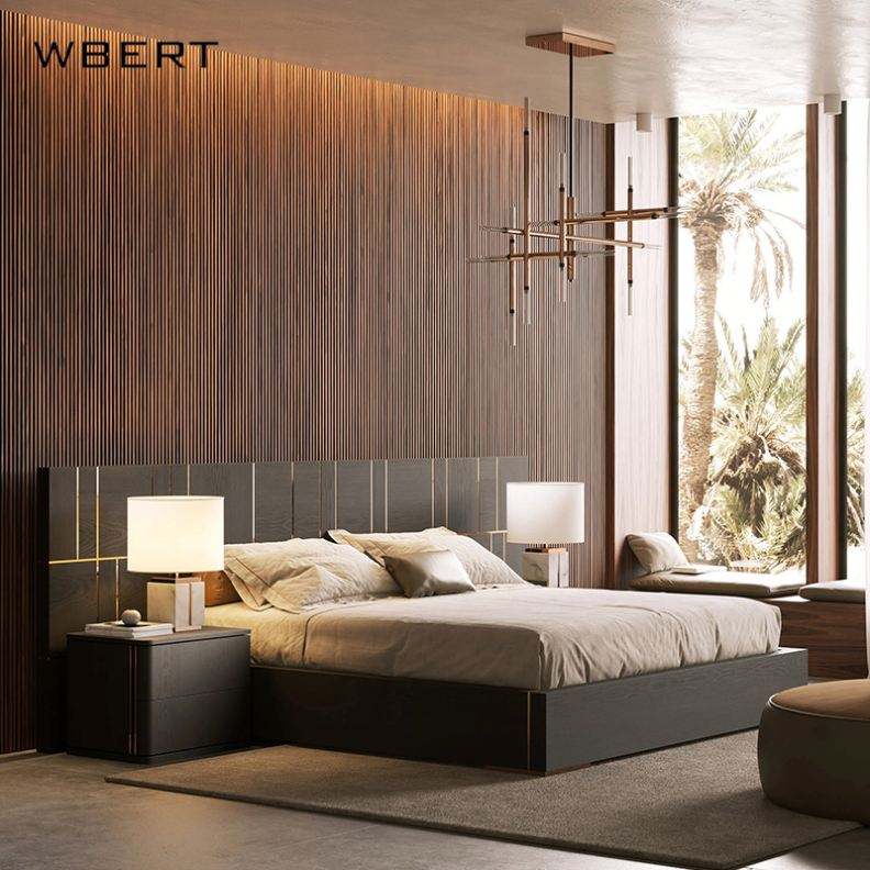 WBERT Luxury Black European Solid Wood Modern Simple Double Bed with Widened Backrest Stainless Steel Pedal Master Bedroom