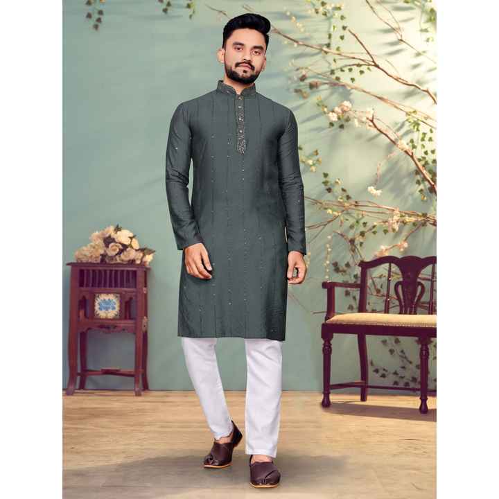 WEDDING COLLECTION PURE VISCOS by NYLON 100% COTTON FABRIC WITH SEQUENCE and THREAD WORK KURTA+PYJAMA GREY APPAREL GARMENT