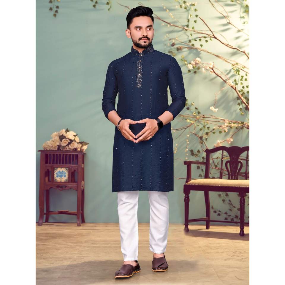 WEDDING COLLECTION PURE VISCOS by NYLON 100% COTTON FABRIC WITH SEQUENCE and THREAD WORK KURTA+PYJAMA NAVY Achkan/Sherwani