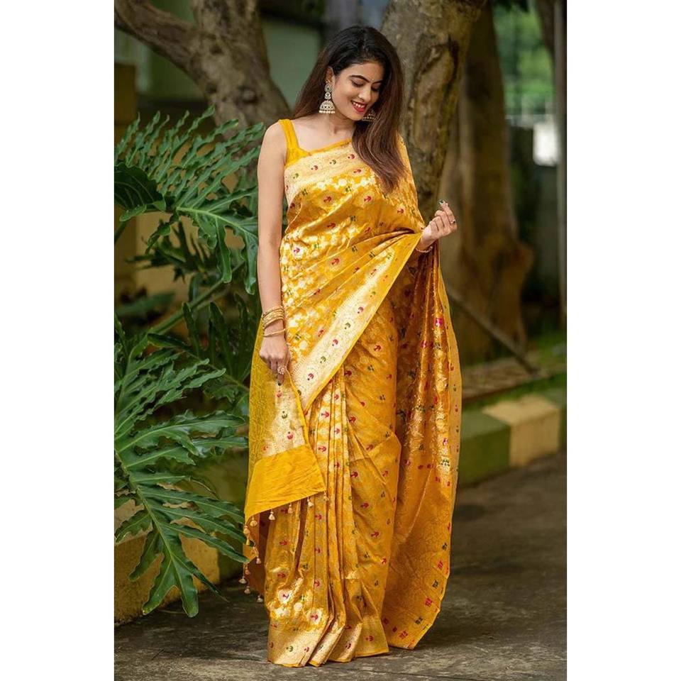 WEDDING WEAR BANARASI SILK SAREE WITH UNSTITCHED BLOUSE YELLOW