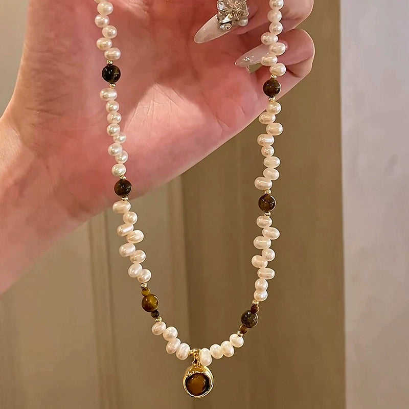 WENCHI Ladies Natural Pearl Necklace Earrings Set Premium Tiger's Eye Design with Gold Plate 450g Bridal Fine Jewelry
