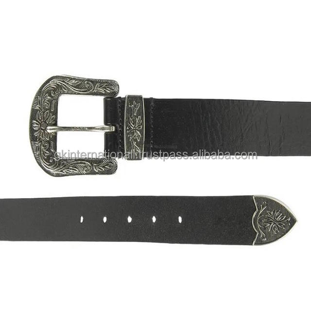 WESTERN DESIGN COWBOY LEATHER HAND TOOLING BELT WITH HEAVY DUTY FLOWER BUCKLE TIP and LOOP