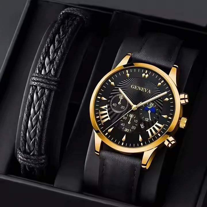 WGS-90 Fashion Black Watches for Men Leather Strap Watch Round Big Dial Date Calendar Wrist Watch Bracelet Set Male Clock