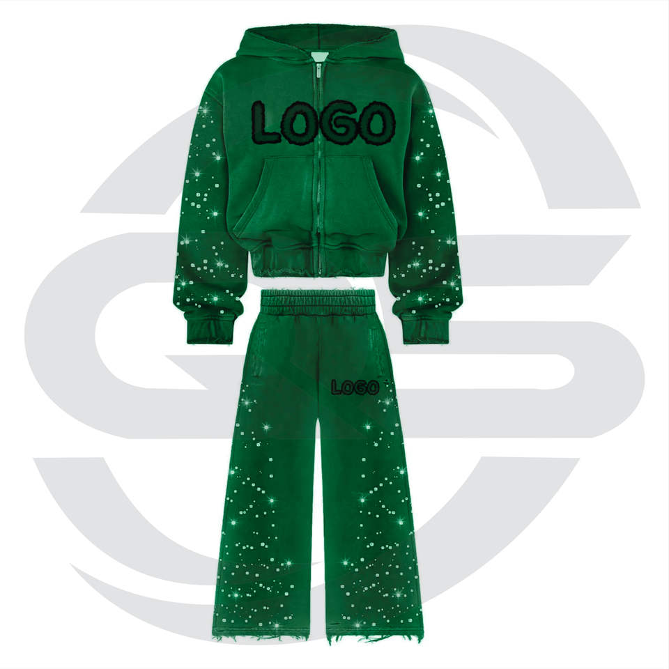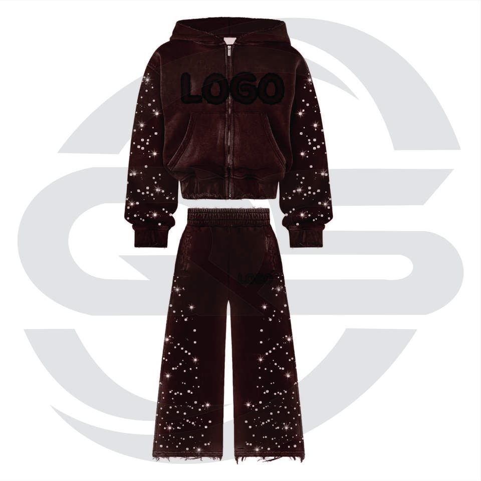 WT Streetwear Custom Distressed Embroidery Sweatpants and Hoodie Sets Sun Faded Acid Wash Rhinestone Tracksuit for Men