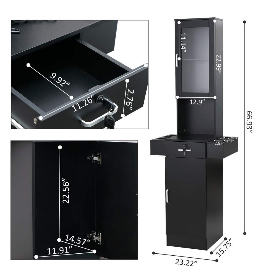 Wall Mounted Black Wood Hair Styling Salon Furniture Barber Station with Glass Door Locking Drawer Dryer Holder Storage Cabinets