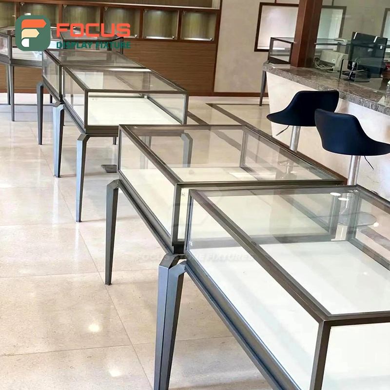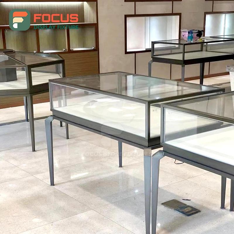 Wall Mounted Wooden Jewelry Counter Glass Display Cabinet Luxury Jewelry Display Shelf High End LED Light Fixture