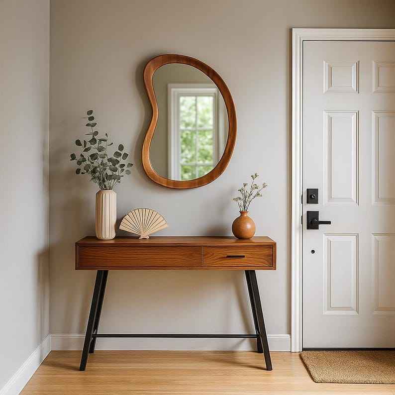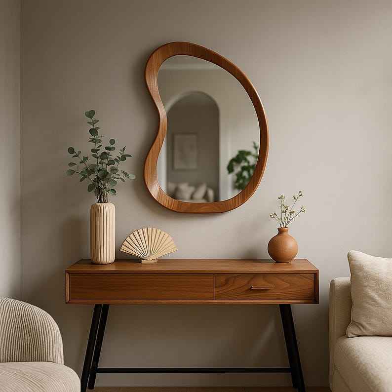 Walnut Asymmetrical Wall Mirror Art Deco Wooden Compact Shape Handmade Eco-Friendly Home Decor Accent