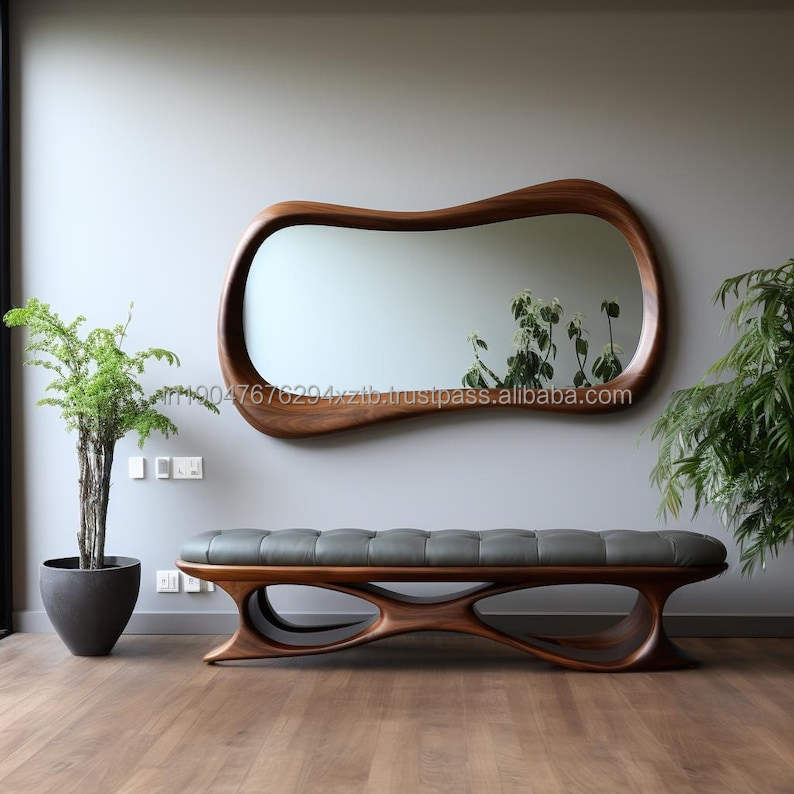 Walnut Wood Asymmetrical Wavy Frame Wall Mirror Handmade Eco-Friendly Lightweight Art Deco Design Home Decor