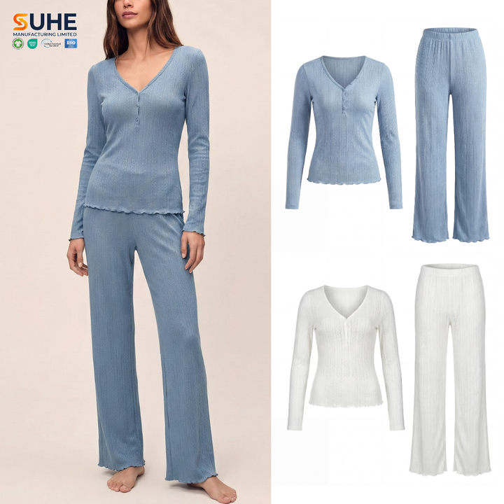 100% Organic Cotton Elegant Knitted Women Drawstring Autumn/Winter Thermal Pajama Set Long Sleeve V-Neck Henley Top Pants Slim
