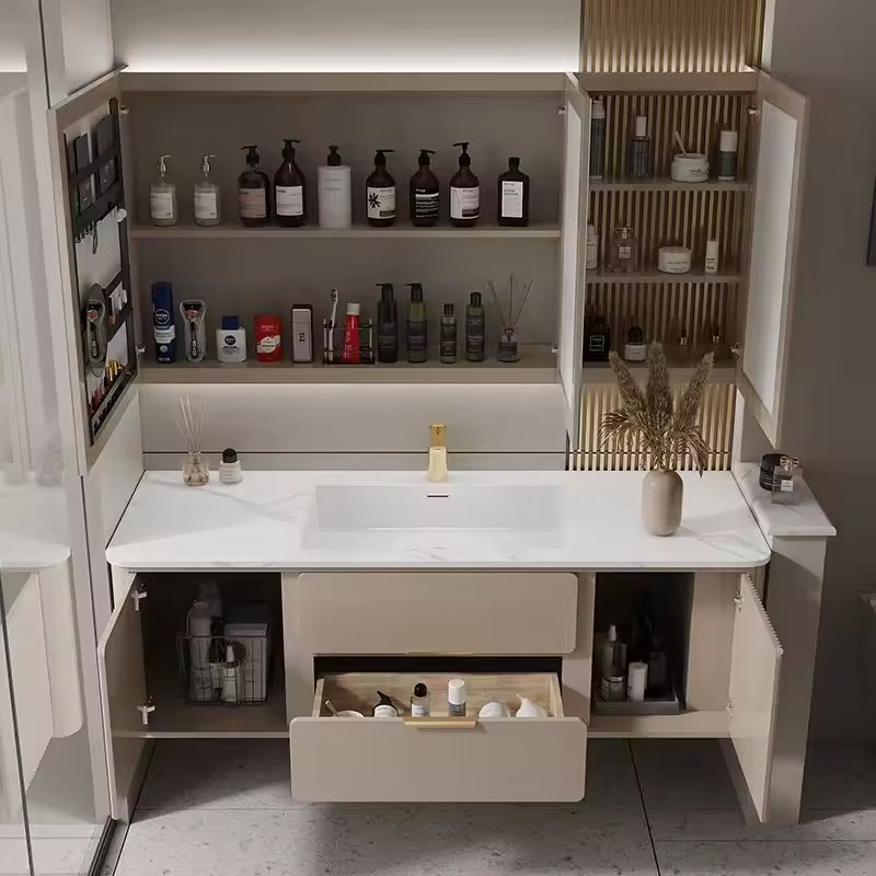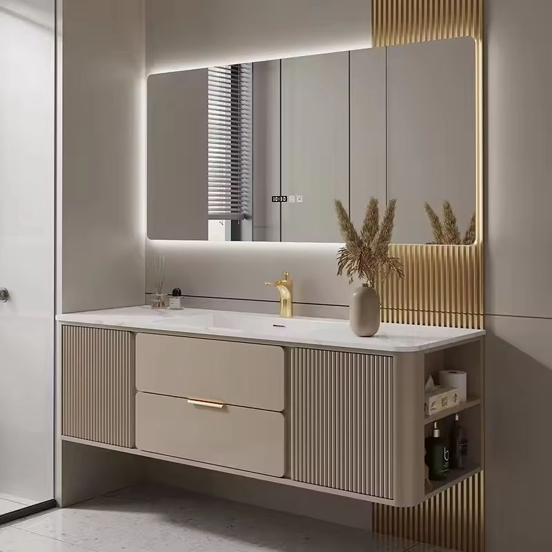 Warm Color Luxury Modern Smart Bathroom Vanity Unit Lacquer MDF Honeycomb Mirror LED Light White Ceramic Basin for Hospital Use