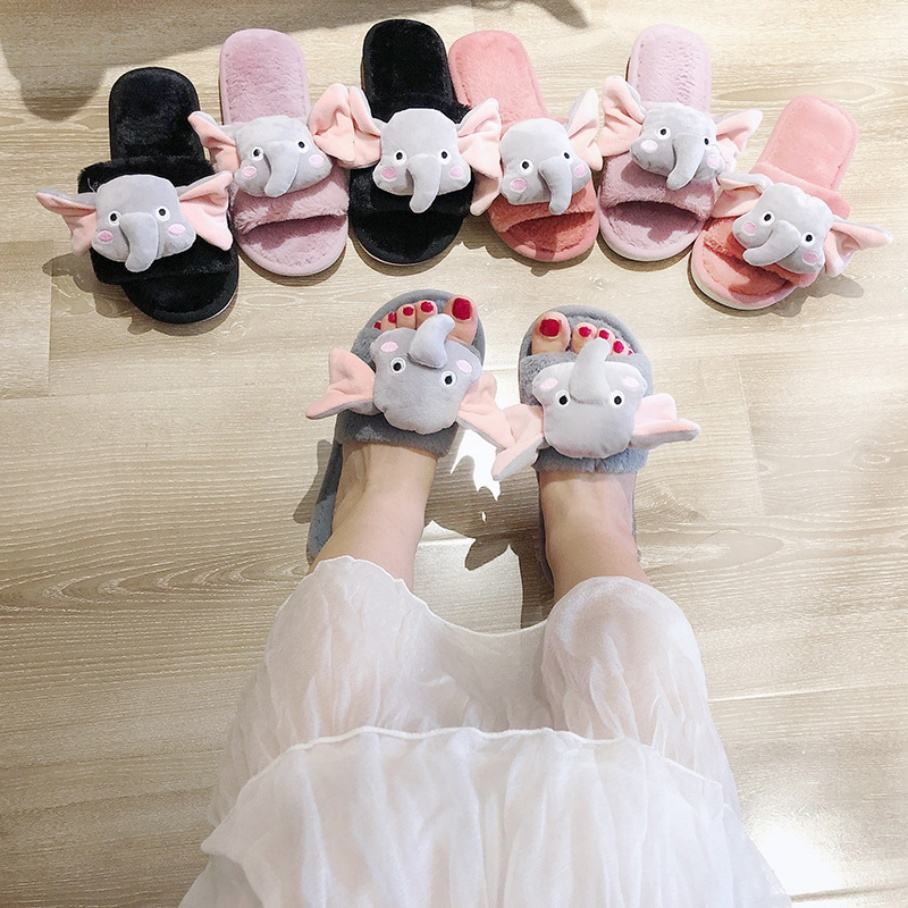 Warm Cute Cartoon Travel Slippers Plush Slippers TPR Rubber Sole Elephant Women Slippers