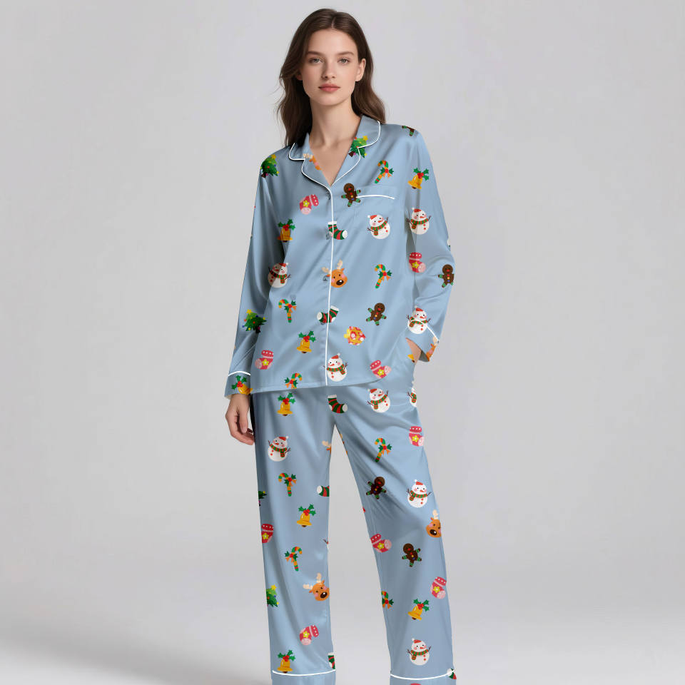Warm Winter & Spring Pajamas for Women Christmas Theme Custom Printed on Demand 100% Silk Satin Breathable Nightwear