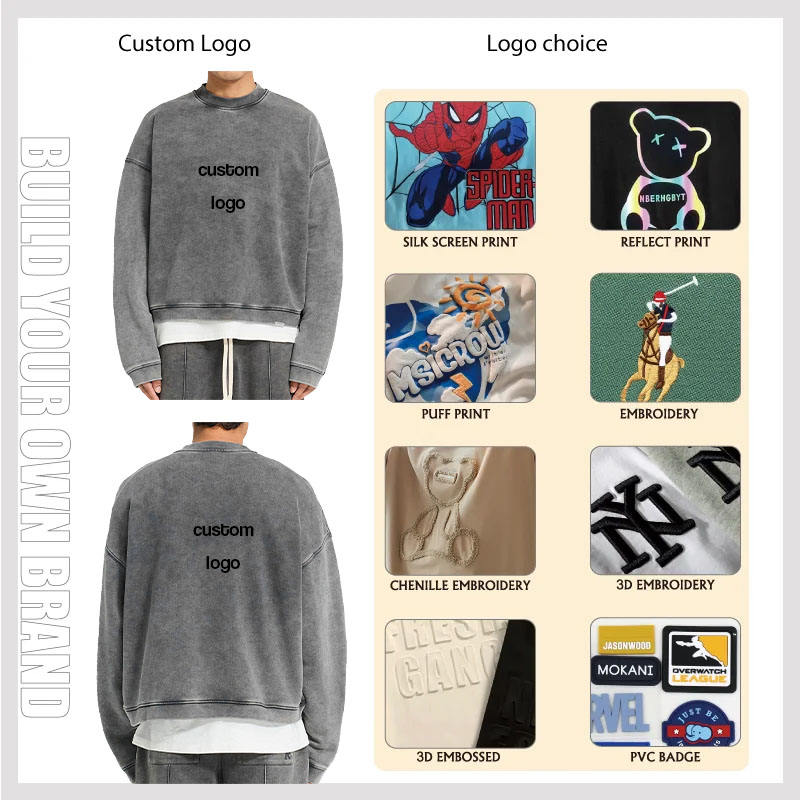 Washed Grey Oversized Sweatshirt Men's Fleece Pullover Cotton Blend Crewneck Long Sleeve Vintage Fade Streetwear Embroidered