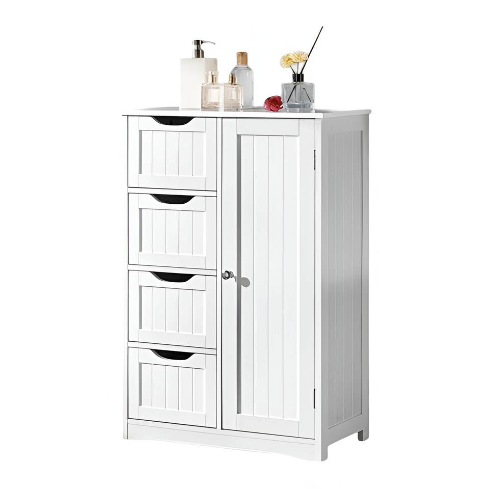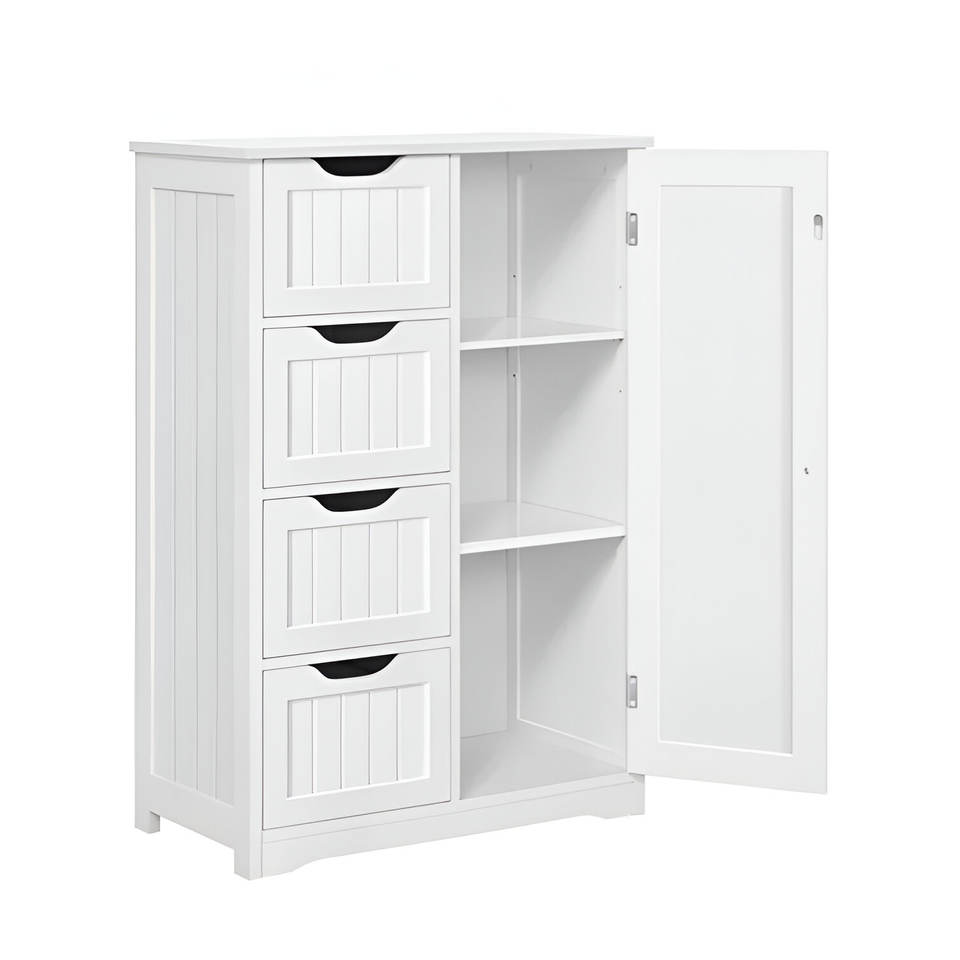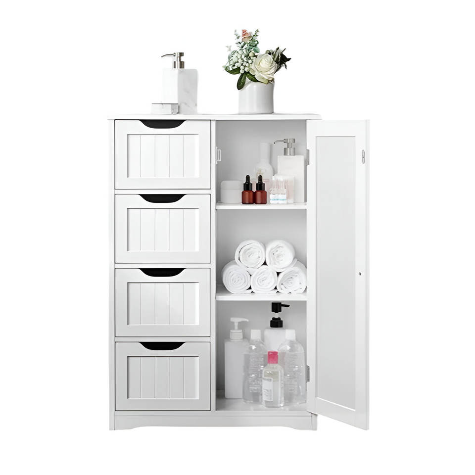 White Wood Standing Bathroom Cabinet with 4 Drawers & 3 Shelves
