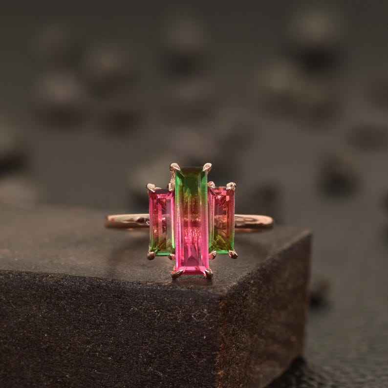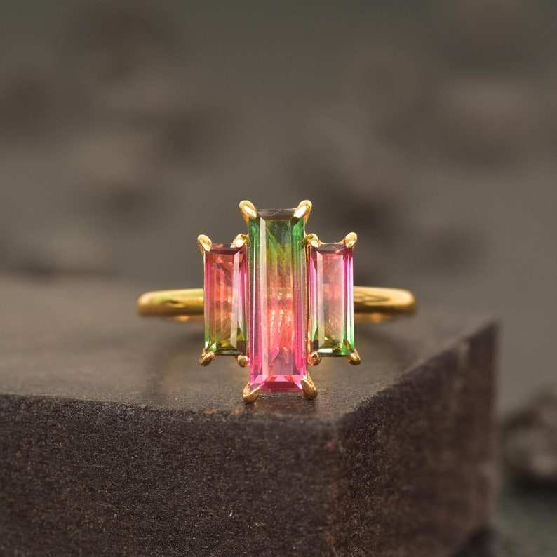 Watermalon Tourmaline Three Stone Rings Wedding Band Ring Anniversary Gift Ring 925 Silver Dainty Ring 14K Gold Plated Ring