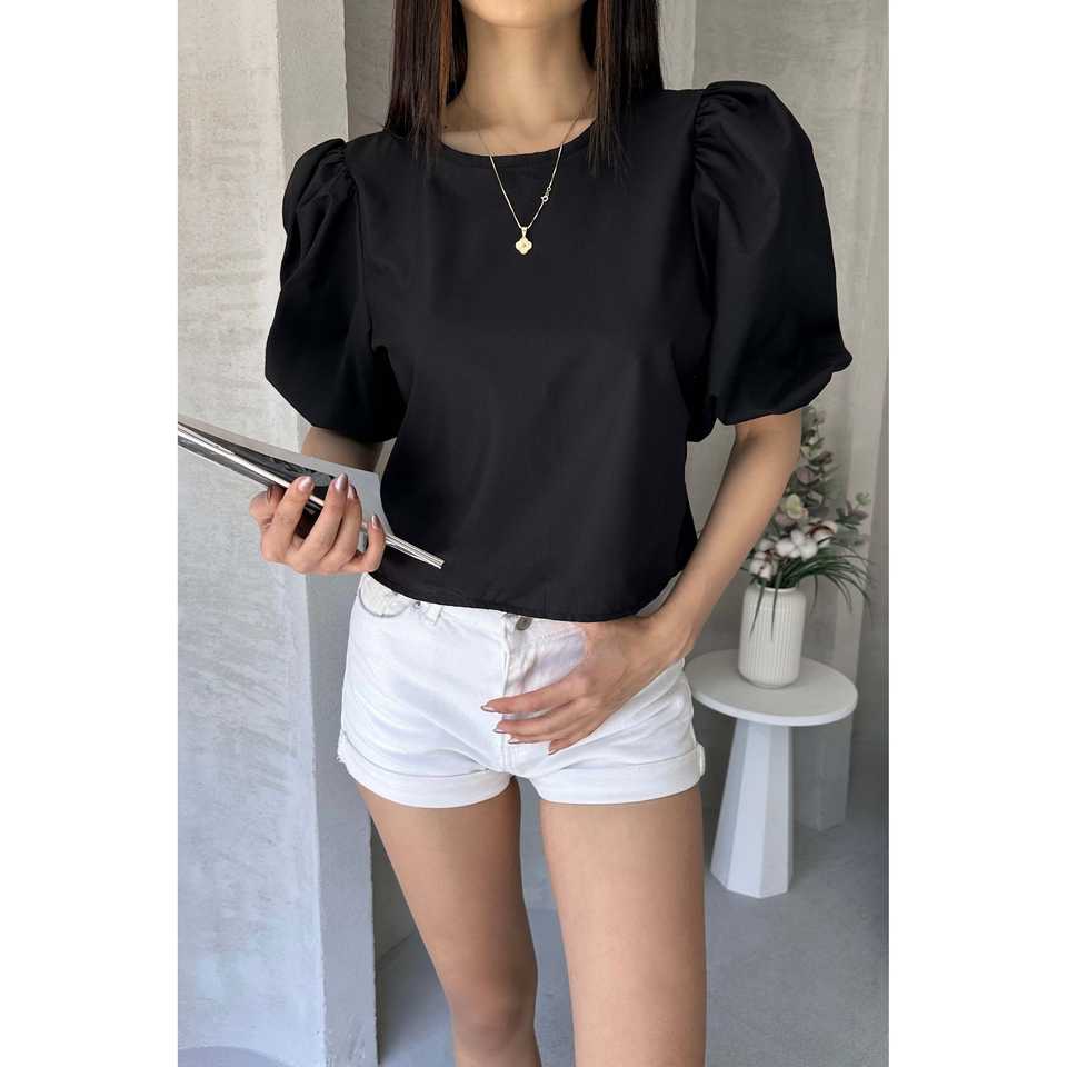 Watermelon Sleeve Poplin Blouse With Bow Detail On Back Women Casual White Eco Friendly Everyday Shirt