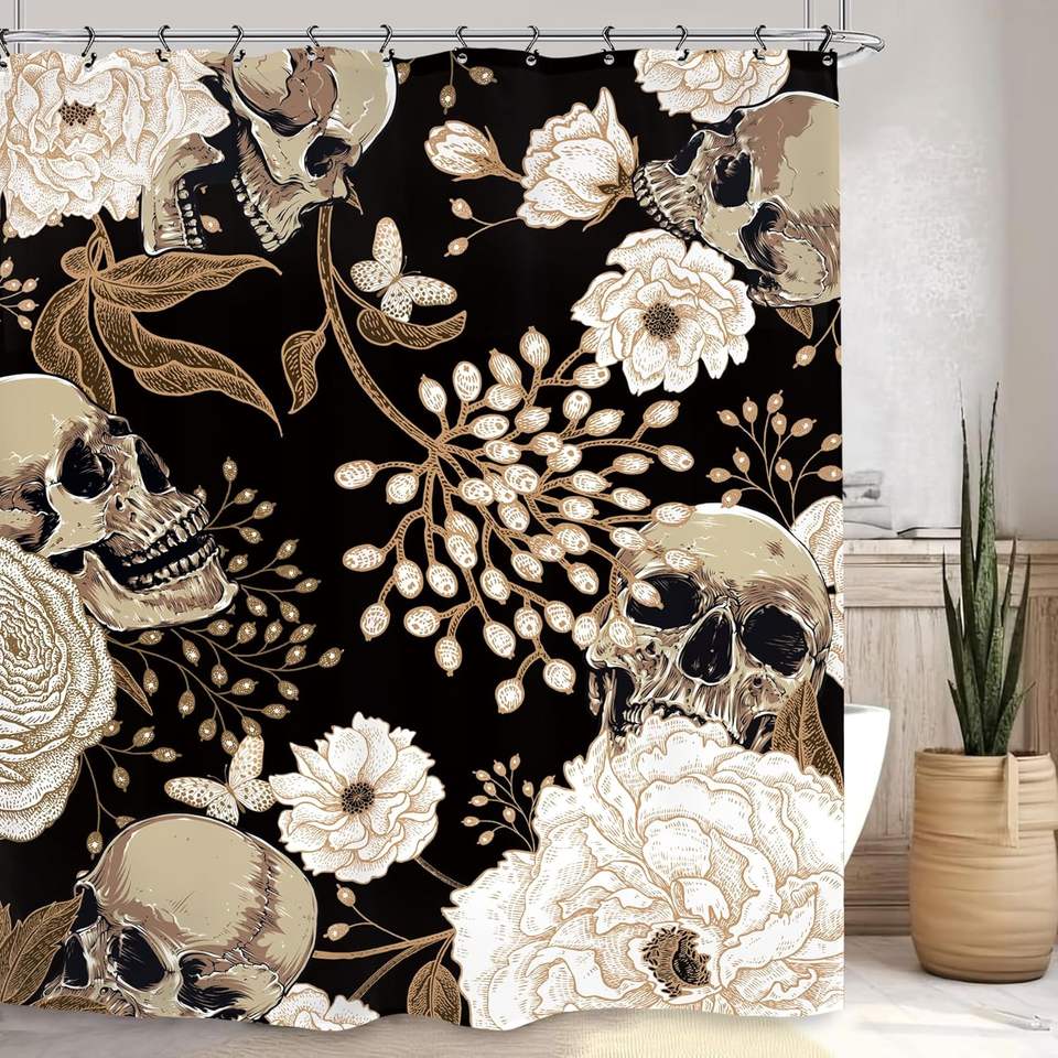 Waterproof Black Floral Skull Shower Curtain with 3D Pattern Vintage Halloween Gothic Home Decor Polyester with Hooks Technology