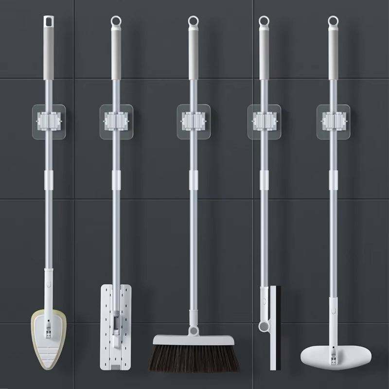 Waterproof PVC Wall-Mounted Kitchen & Bathroom Storage Rack with Traceless Mop Clip and Broom Hanger