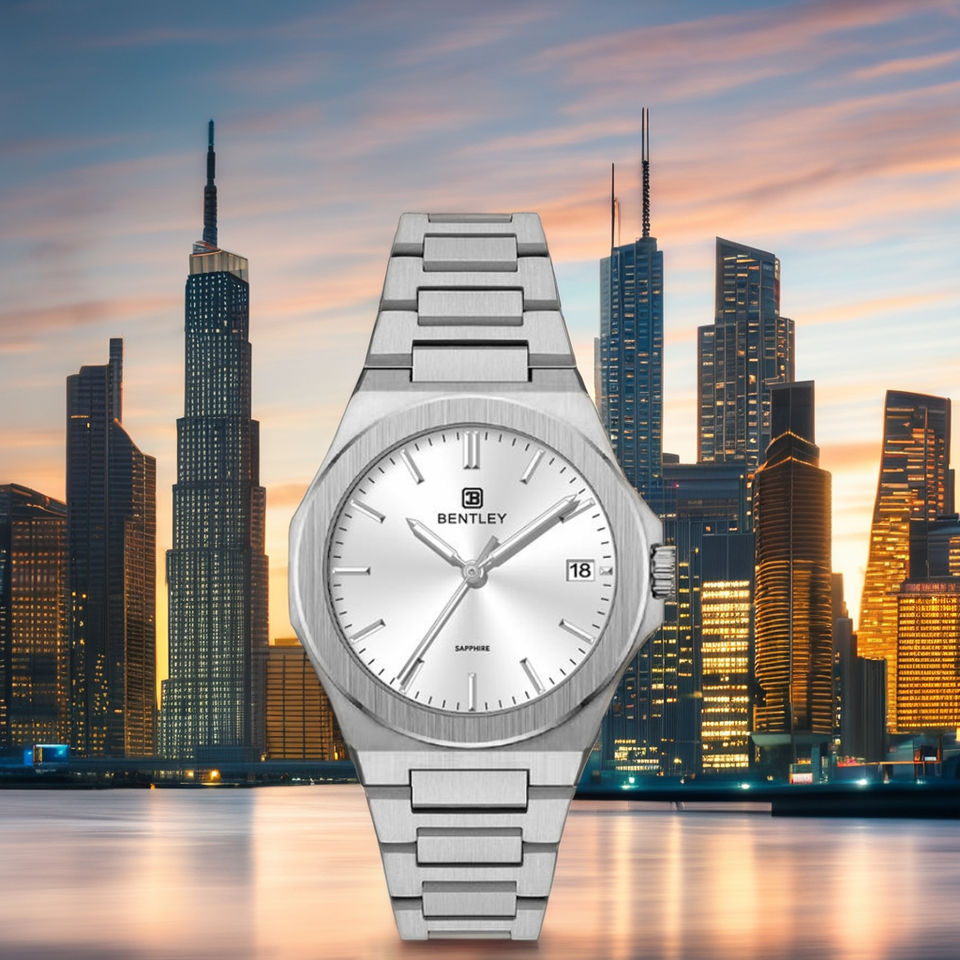 Waterproof digital wristwatch styled with classic quartz movement and clean dial