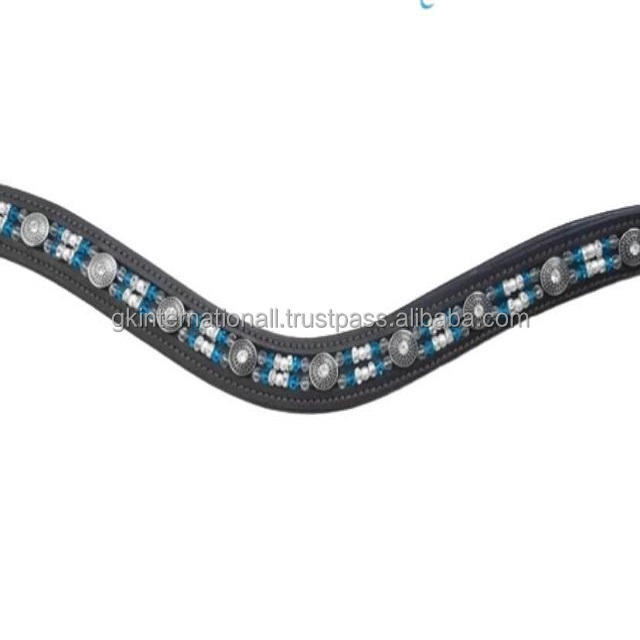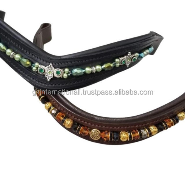 Wave Shape Black English Leather Horse Brow band Soft Padded with Multicolor Custom Design Beads Pearls Decorative Chain