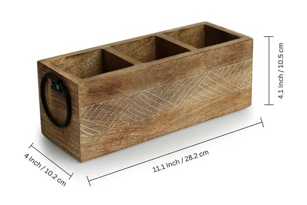 Waved Stationery & Cutlery Holder 3 Partitions Mango Wood Hand-Etched Wooden Utensil Caddy Countertop Cutlery Holder