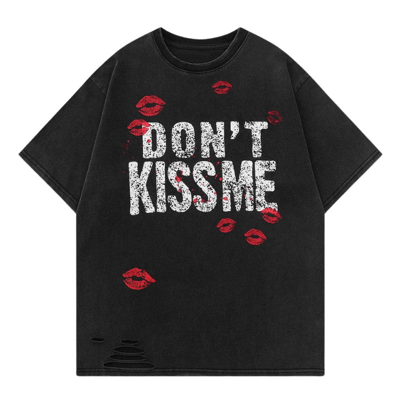 Wax Dyed Vintage Ripped Kiss Print Distressed Tee Custom Screen Print T-shirt Men Heavyweight Cotton Blank Oversized TShirt