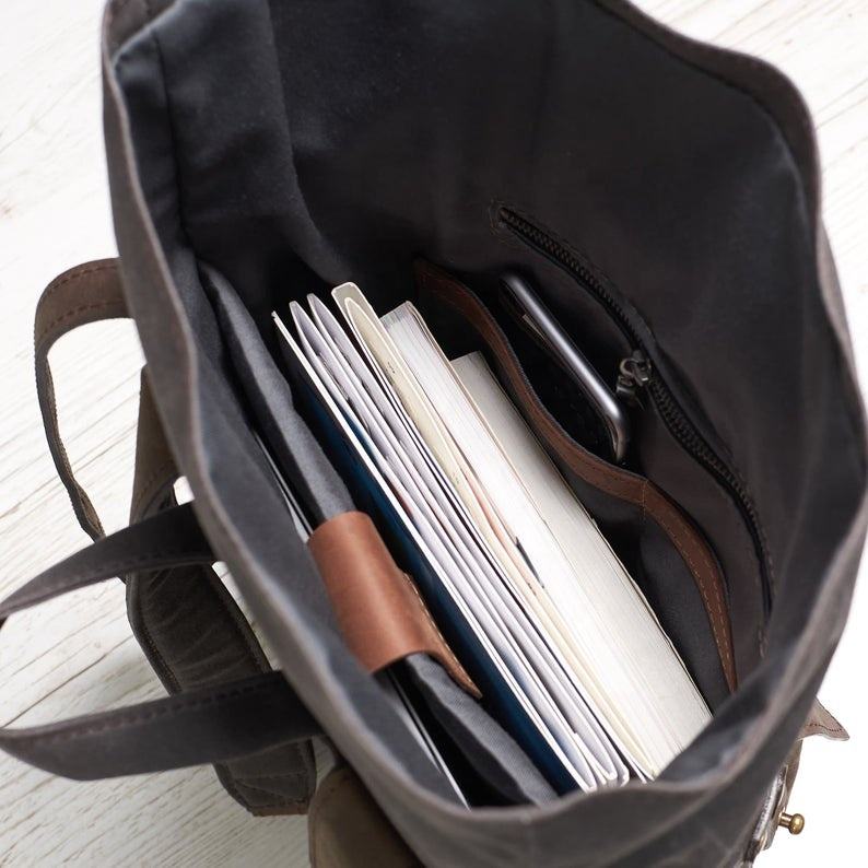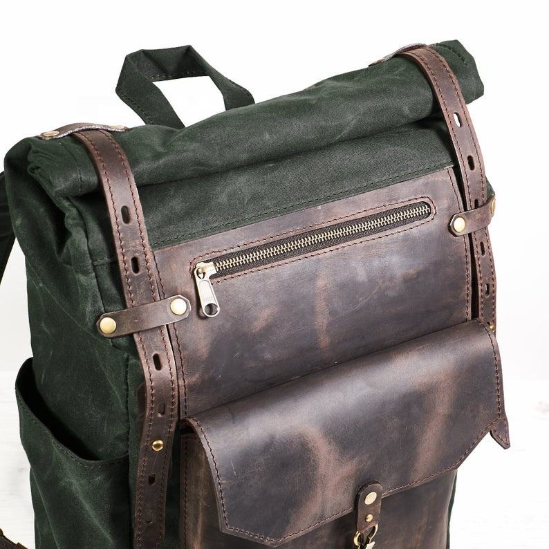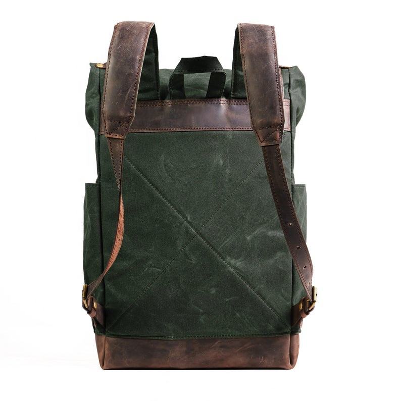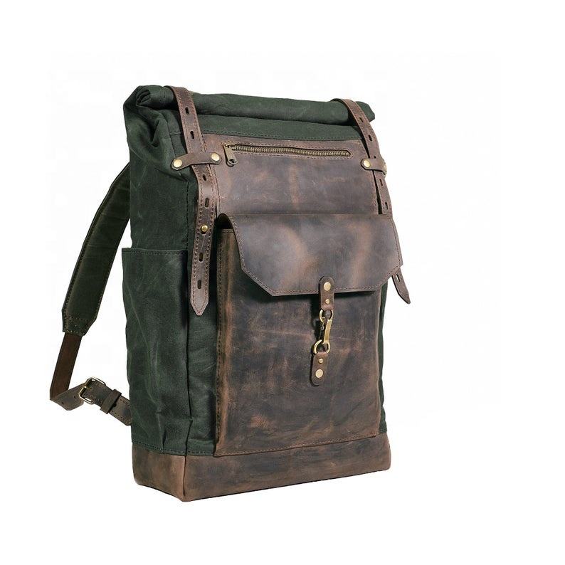 Waxed Canvas Leather Men's Roll Top Backpack Waxed Cotton Rucksack. IBS-0006