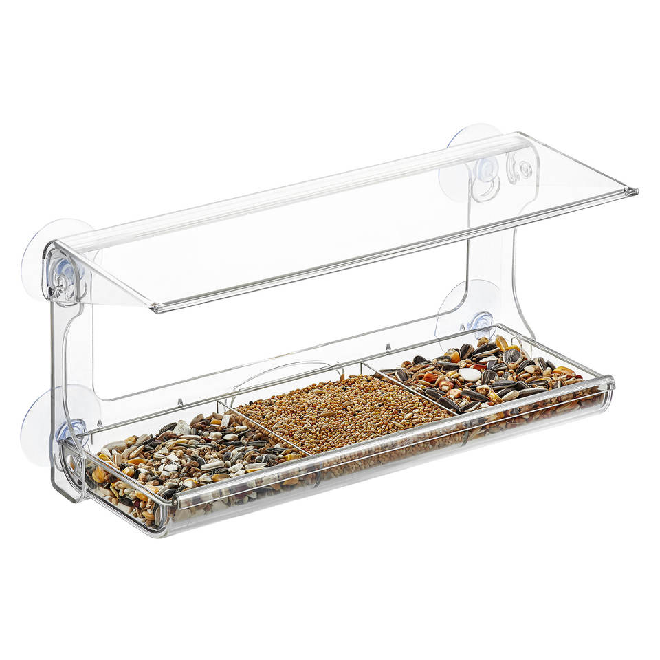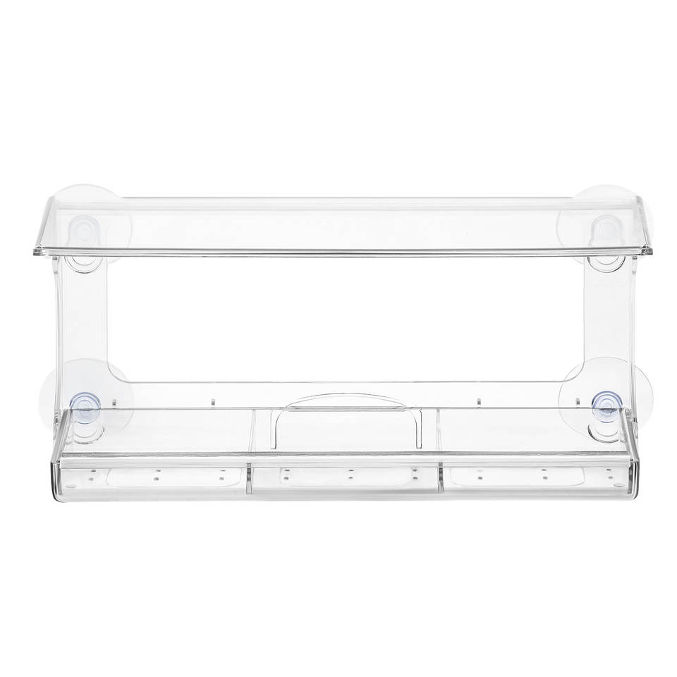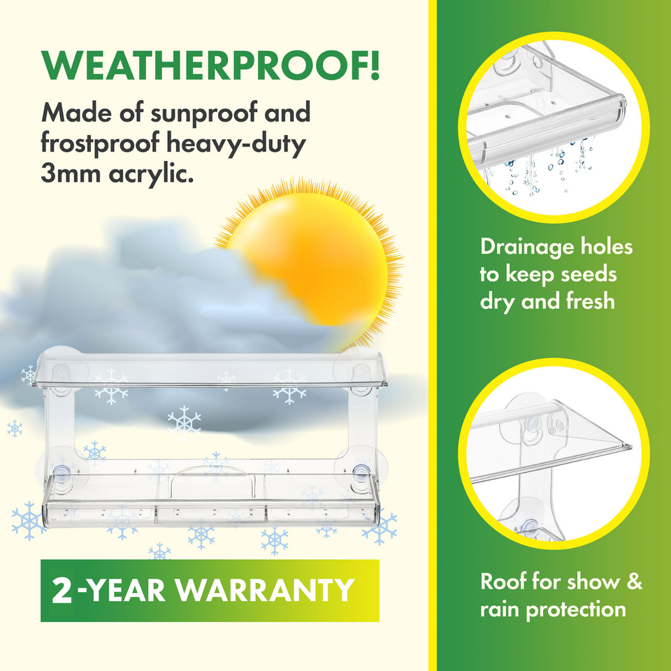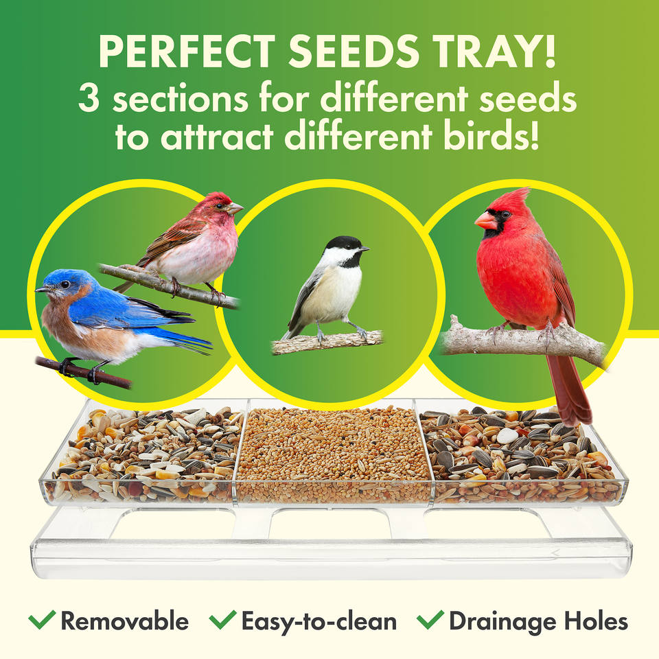 Weatherproof Acrylic Window Bird Feeder with Strong Suction Cups, Drainage Holes, and 3-Sectioned Removable Tray