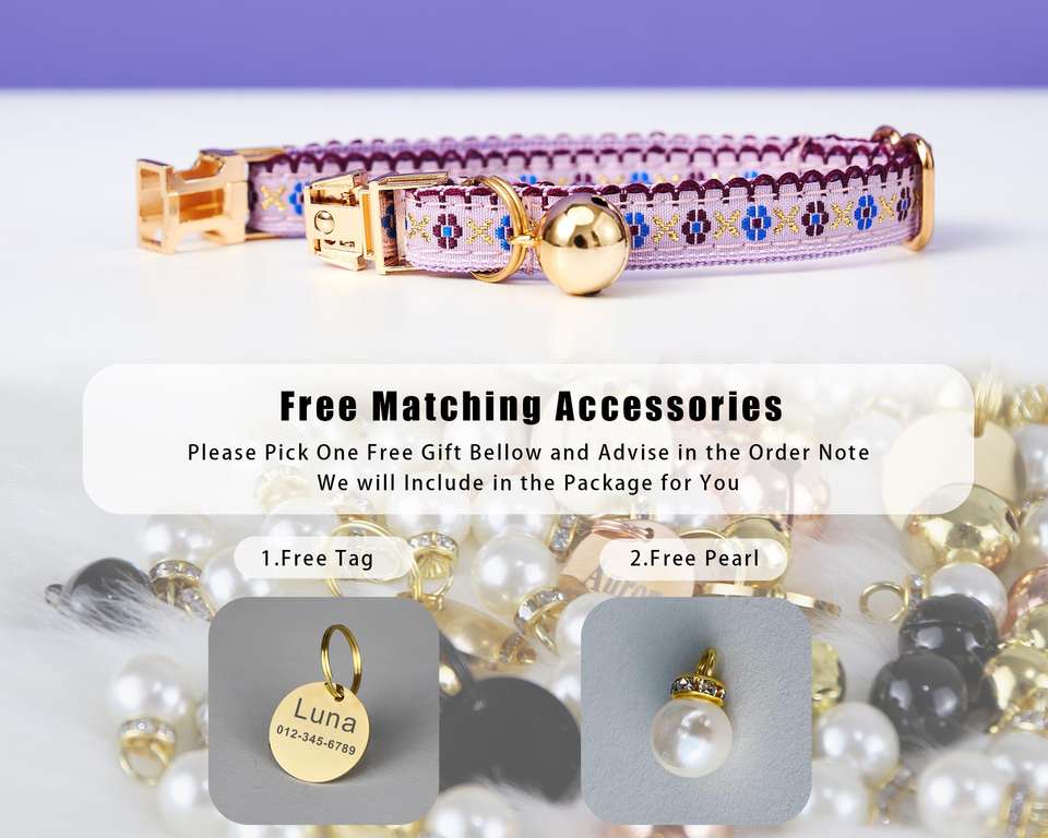 Webbing Tribal Personalized Cat Collar Leash Set, Custom Engraved Kitten Name Metal Buckle, Free Gold Bell, Female Pet Gift