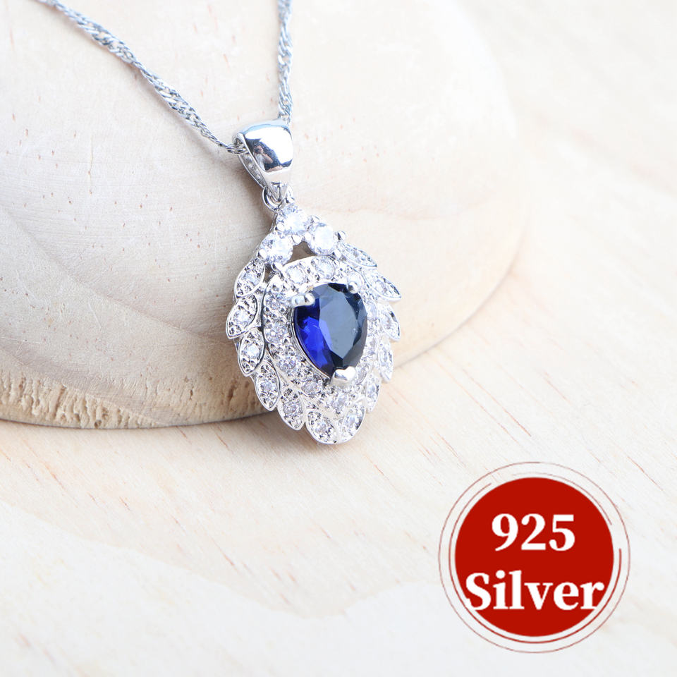 Wedding 925 Sterling Silver Blue Sapphire Jewelry Sets for Women Cubic Zircon Topaz Bridal Earrings Ring Pendant Necklace Set