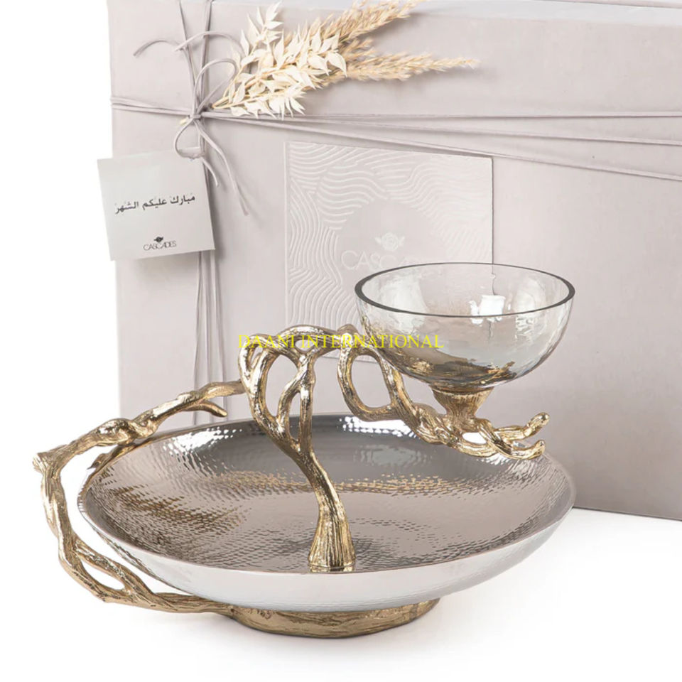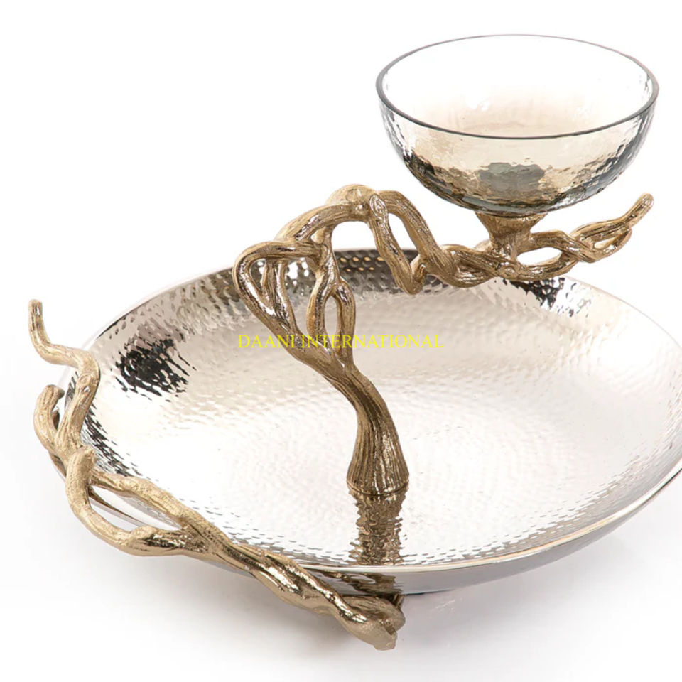 Wedding Decorative Tree Branch Serving Bowl with Glass Dish Luxury Golden Snack and Dry Fruit Server Chip And Dip Bowl for Gift