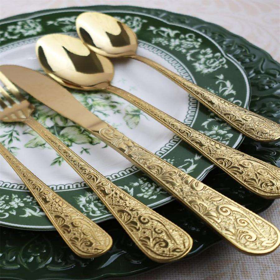 Wedding Dinner Time Usage Gold Silverware Stainless steel Cutlery Set Engrave Design Textured OEM ODM Customized Flatware Latest