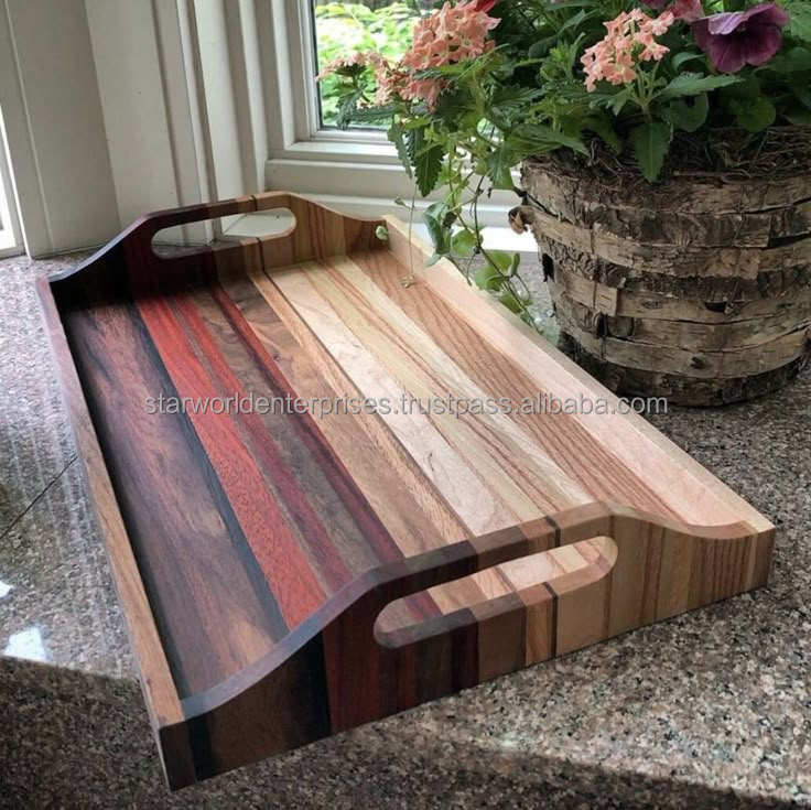 Wedding & Party Decorative Enamel MDF wooden Tray with Bamboo Wood Handles Coffee Tea Breakfast Food Serving Tray