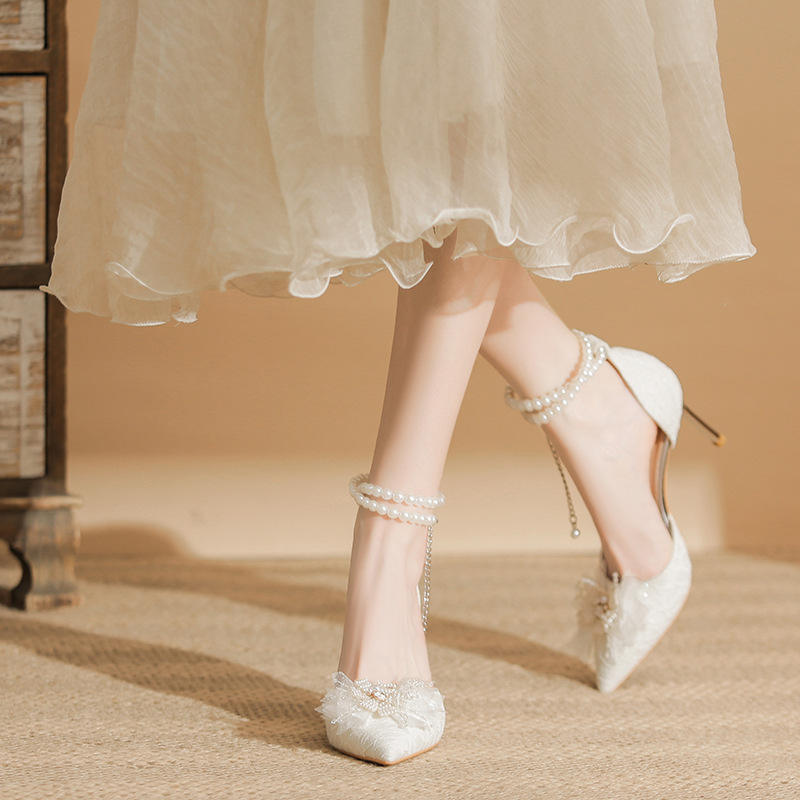 Wedding Shoes Women Bridal White Main High Heels Rhinestone Single Shoes Pointed Toe French Temperament Lace Shoes