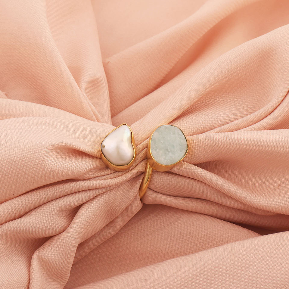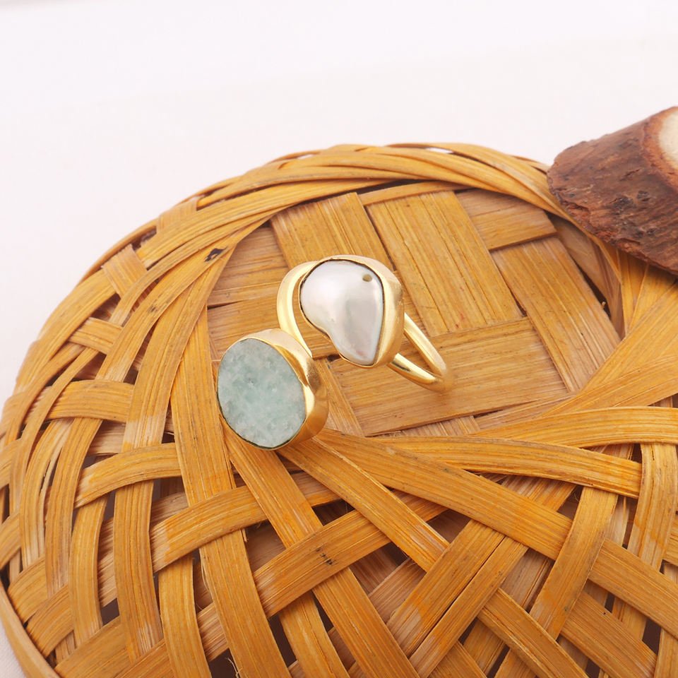 Wedding Jewelry Natural Freshwater Pearl Raw Amazonite Dual Stone Adjustable Ring Brass Gold Plated Statement Open Circle Rings