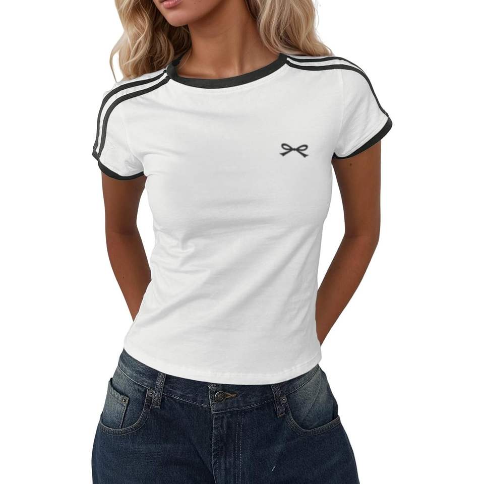 Weetiotio Women's Y2K Cute Crop Tops Bow Embroidery Summer Coquette Clean Girl Aesthetic Shirts Baby Tees Knit Tops