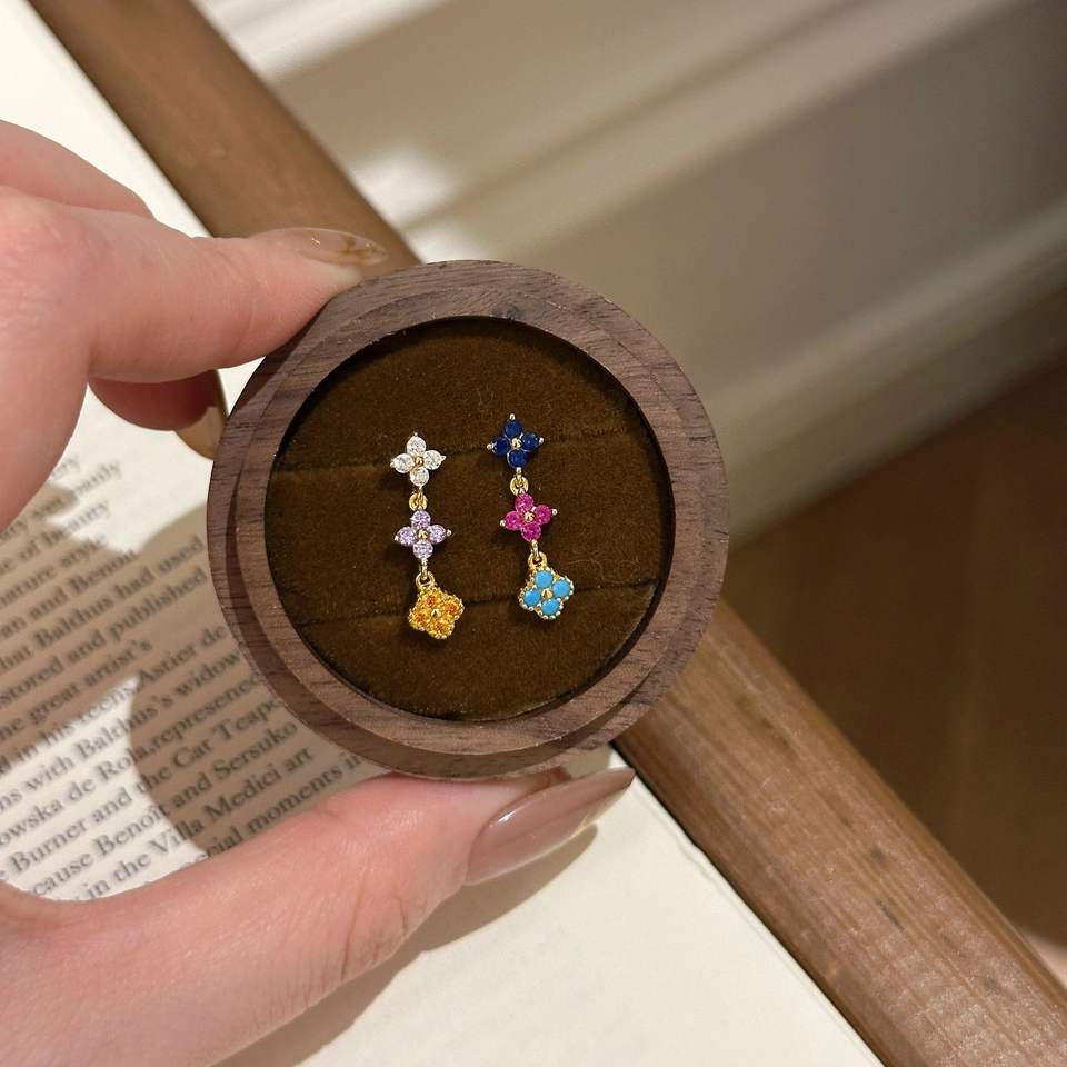 Wenchi S925 Sterling Silver Four-leaf Clover Lucky Colorful Diamond Studded Dangle Earrings Sweet Fashion Accessory Model 21816