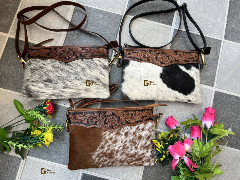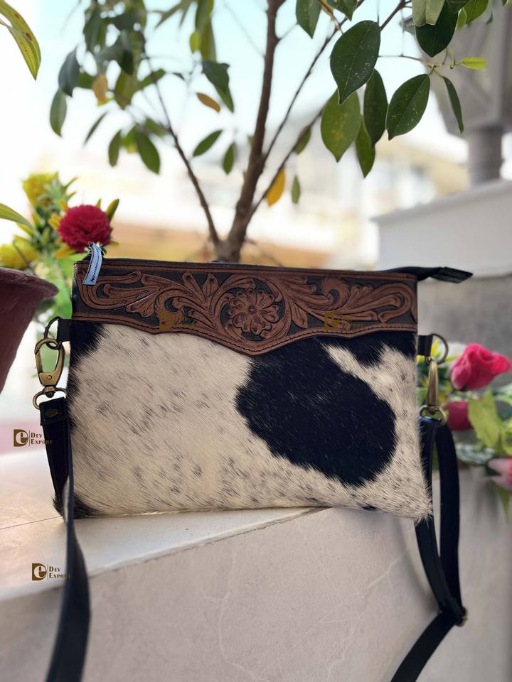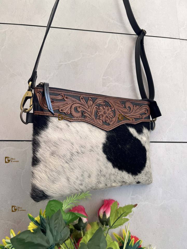 Western Bohemian Style Cowhide Leather Handtooled Sling Bag Unisex Zipper Closure with Nylon Lining Hot Selling Handmade Handbag