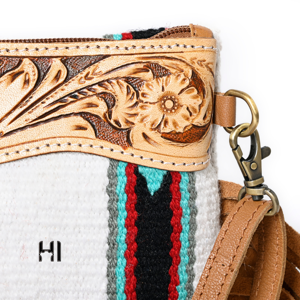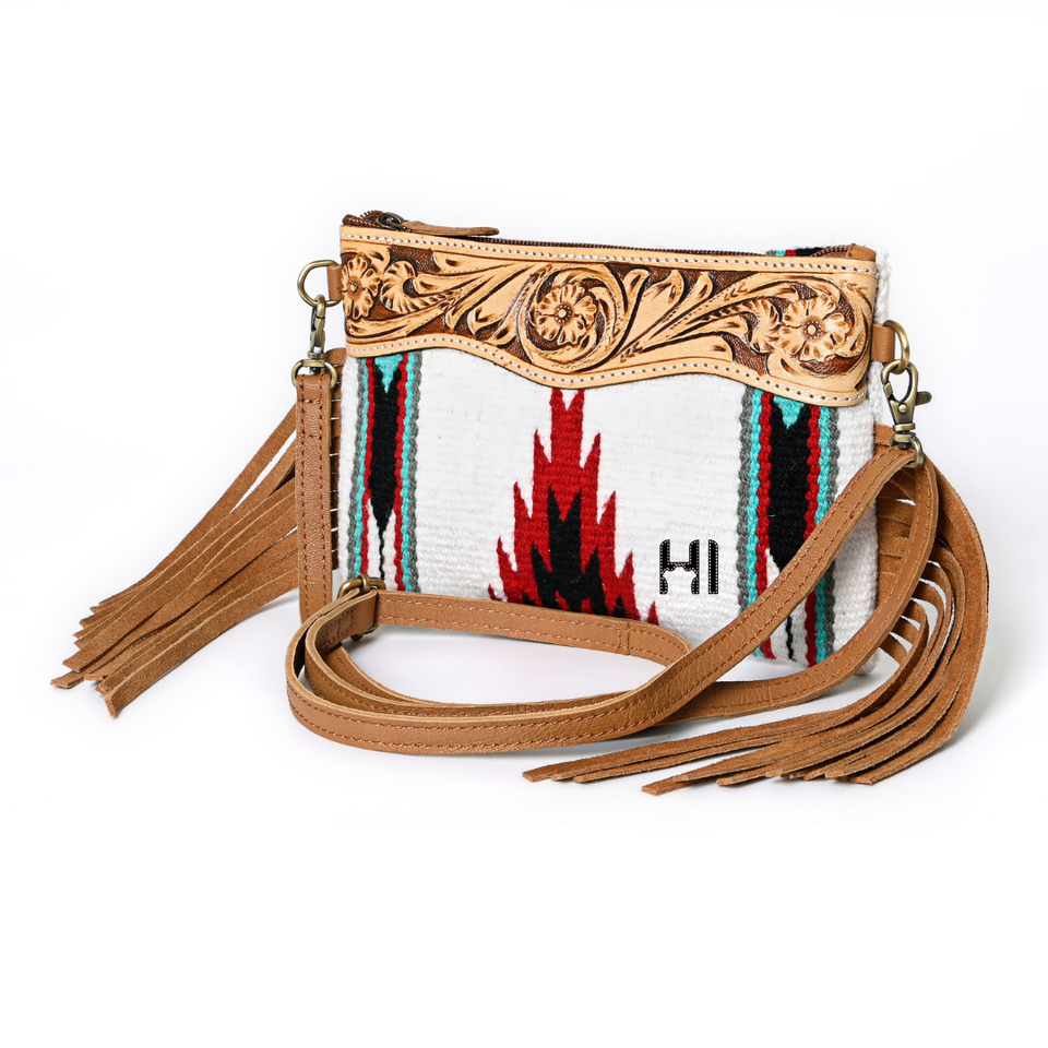 Western Boho Chic Vintage Mini Bag for Ladies Cowhide Tooled Cow Suede Fringes Fashionable Preppy Style Crossbody Saddle Blanket