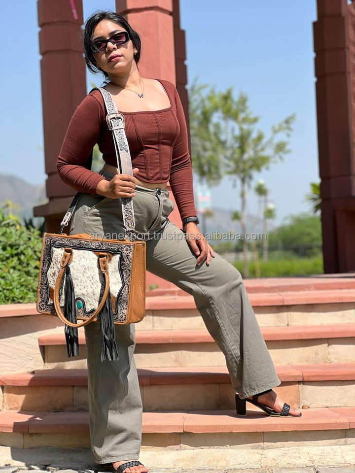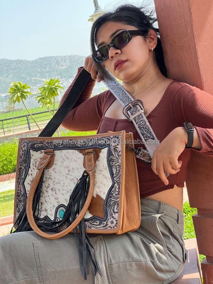 Western Cowhide Fur Leather Fringe Tote Bag Stylish Hand Tooled Carving Purse Hot Selling Bags for Women's Multi Use