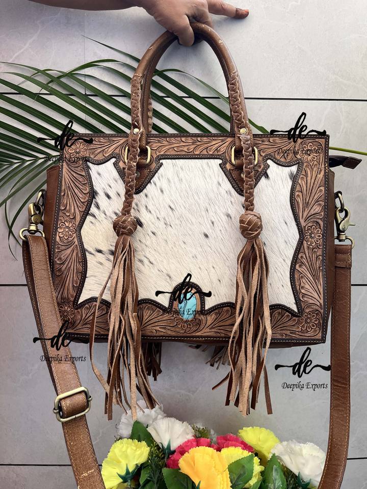 Western Cowhide Fur Leather Fringe Tote Bag Stylish Hand Tooled Carving Purse Hot Selling Bags for Women's Multi Use