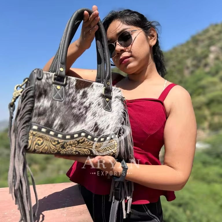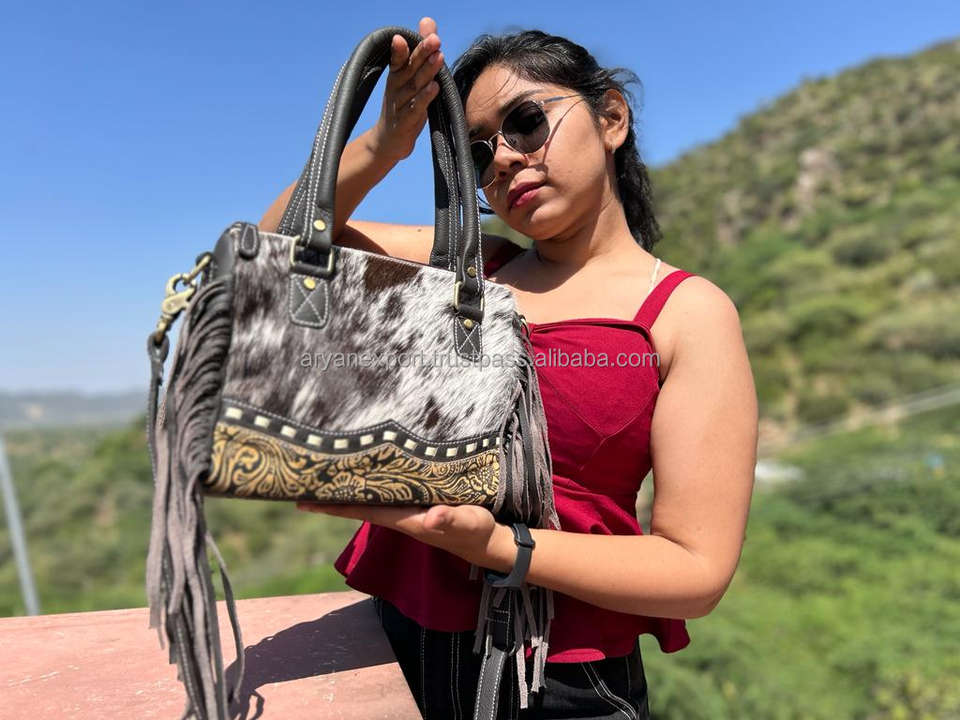 Western Cowhide Leather Hand Tooled Carving Leather Fringe Tote Bag Stylish Purse Leather Bags for Women's Multi Use