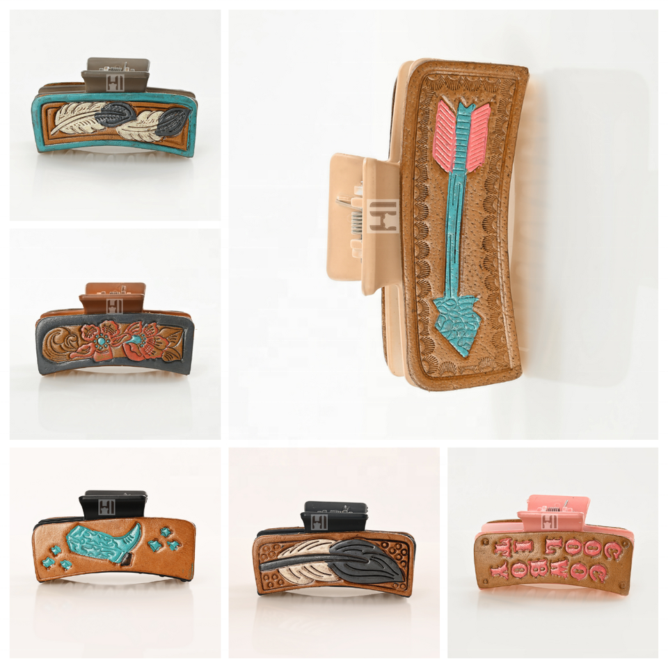 Western Fashion Claw Clip with Genuine Cowhide Tooled Leather Patch Hair Accessories Cowgirl Fashion Large Hair Pin Wholesaler