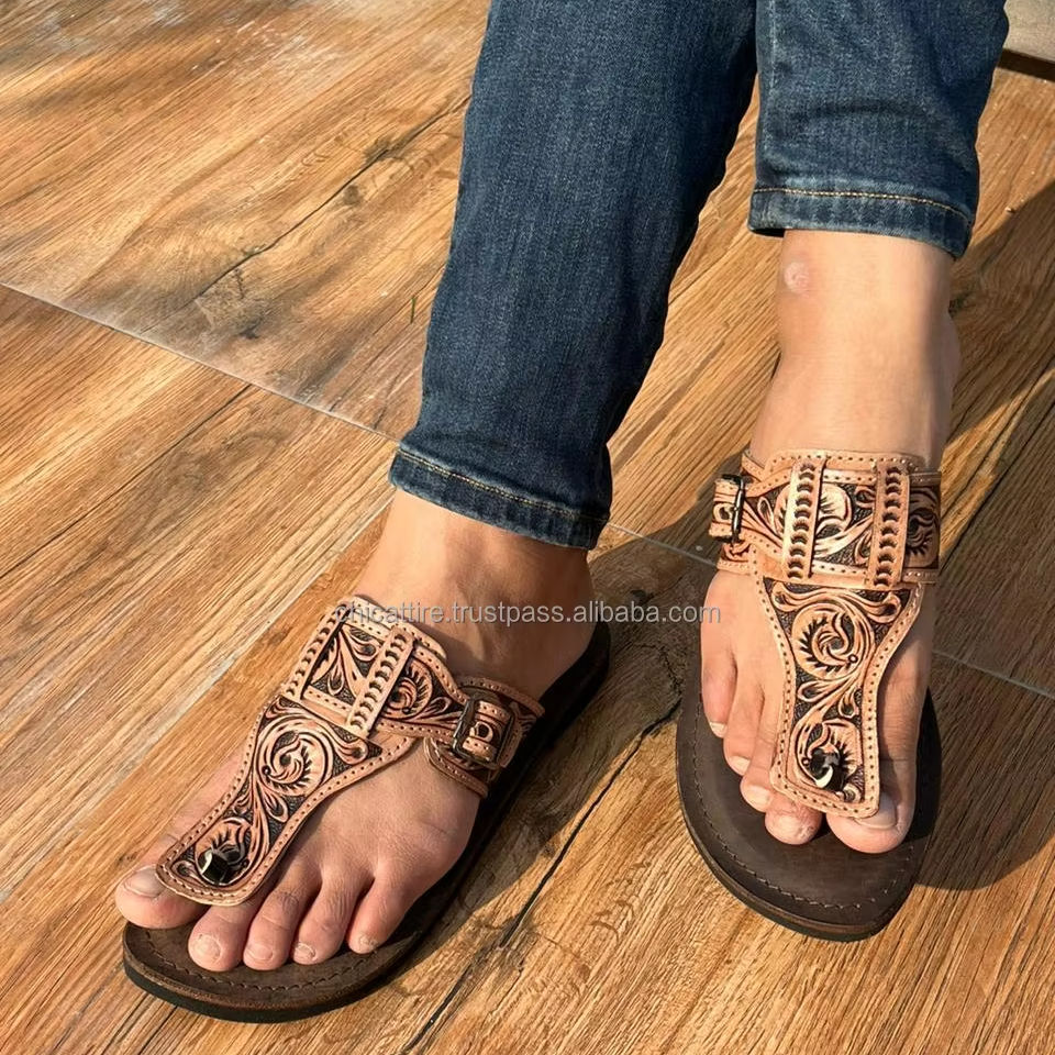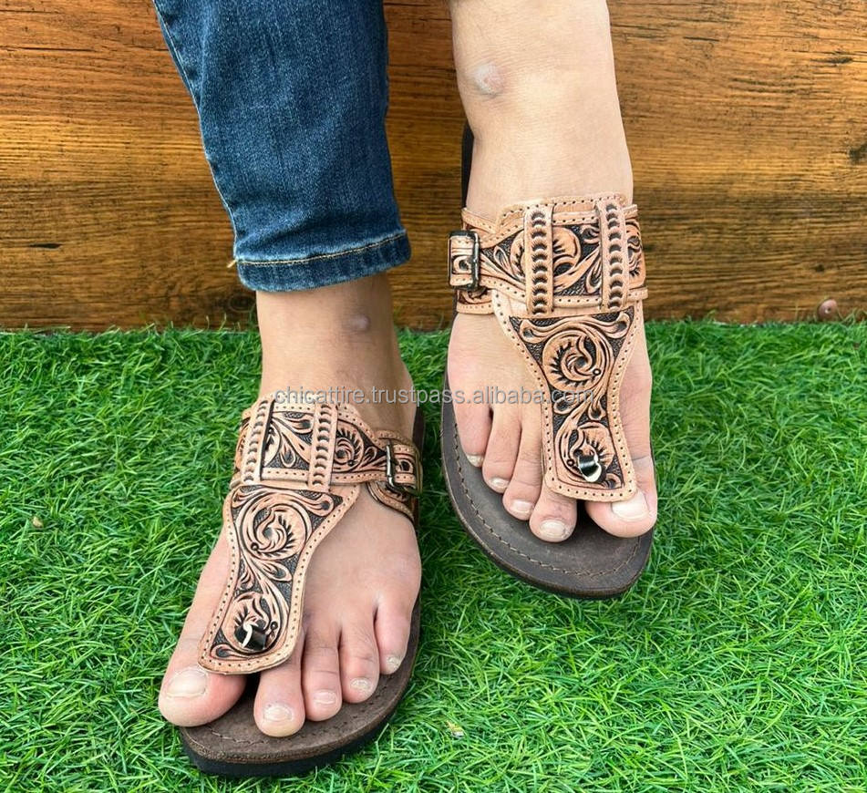 Western Fashion Customizable Hand-Tooled Leather Boho Sandals for Women Genuine Leather Floral Design Outdoor Flipflop Footwear