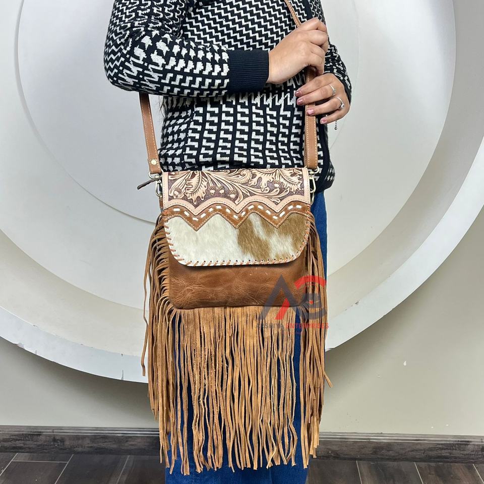 Product name:Hand Tooled Cowhide Leather Fringe Crossbody Bag