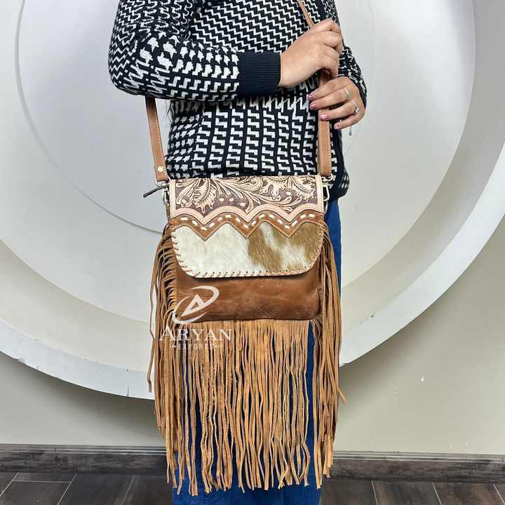 Hand Tooled Cowhide Leather Fringe Crossbody Bag