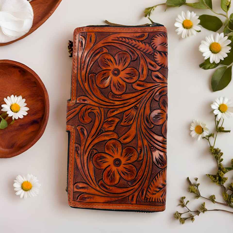 Western Genuine Leather Bohemian Portable Clutch Wallet Floral Hand Tooling Multi-Use 2025 New Designer Stylish Women's Clutches